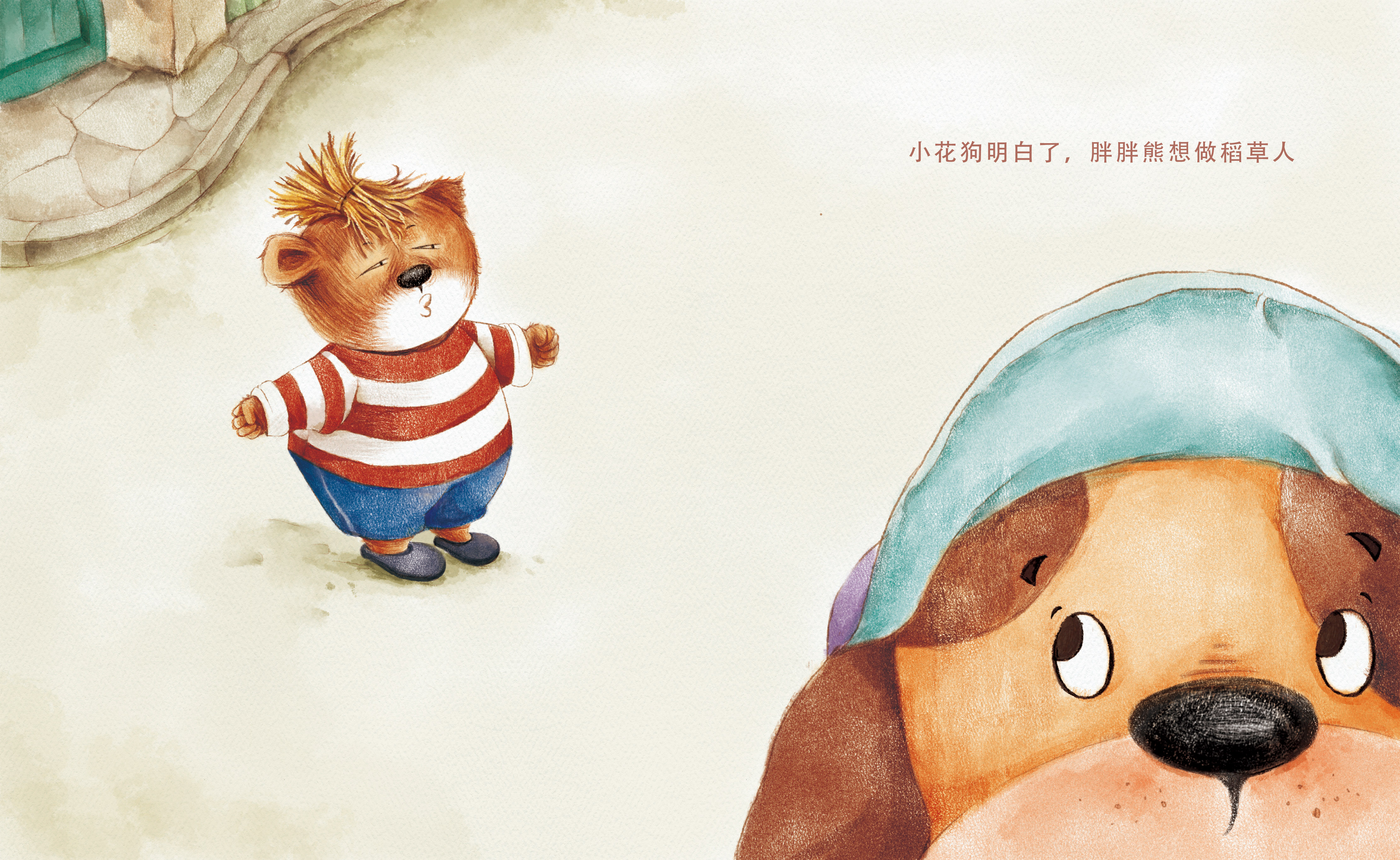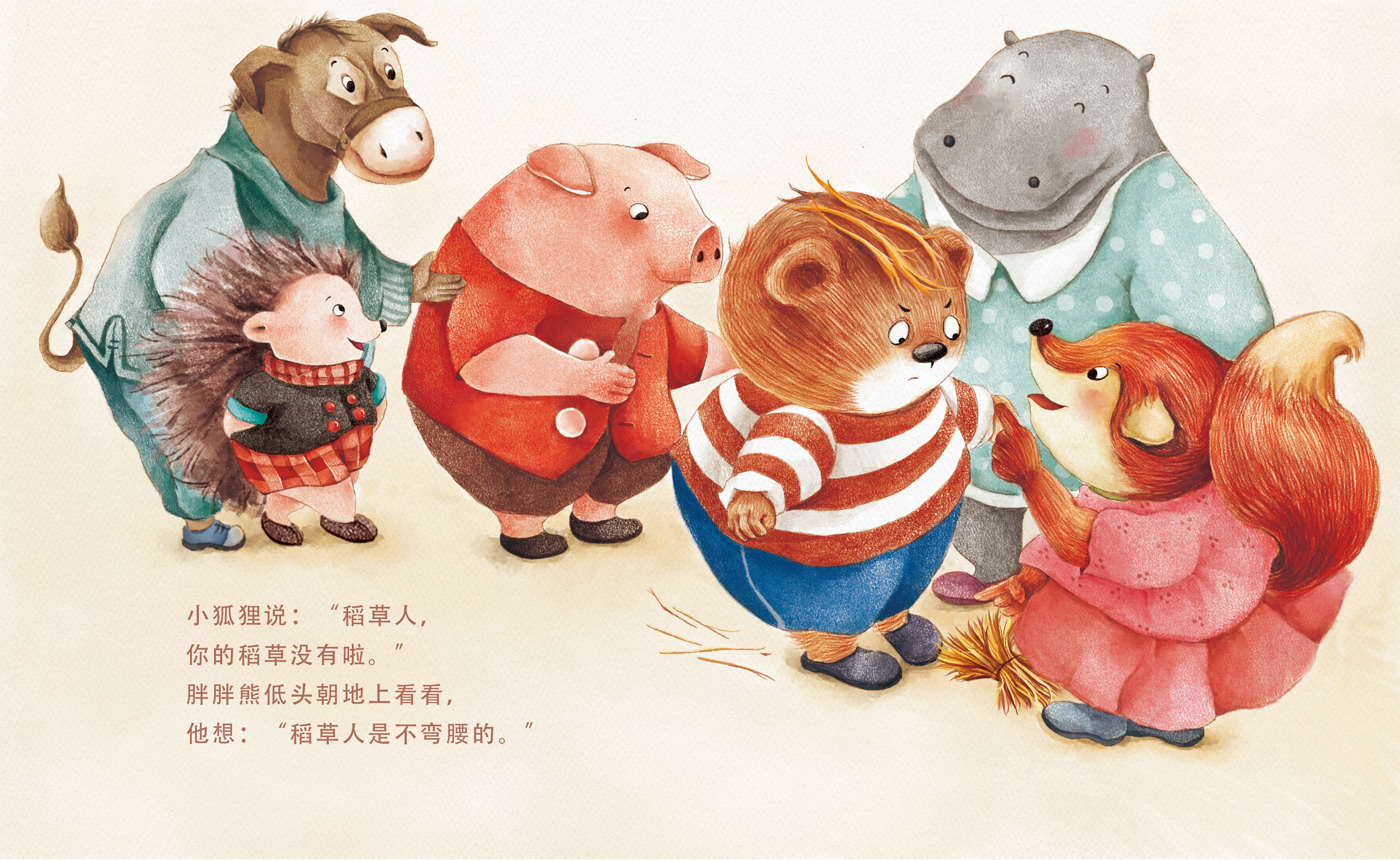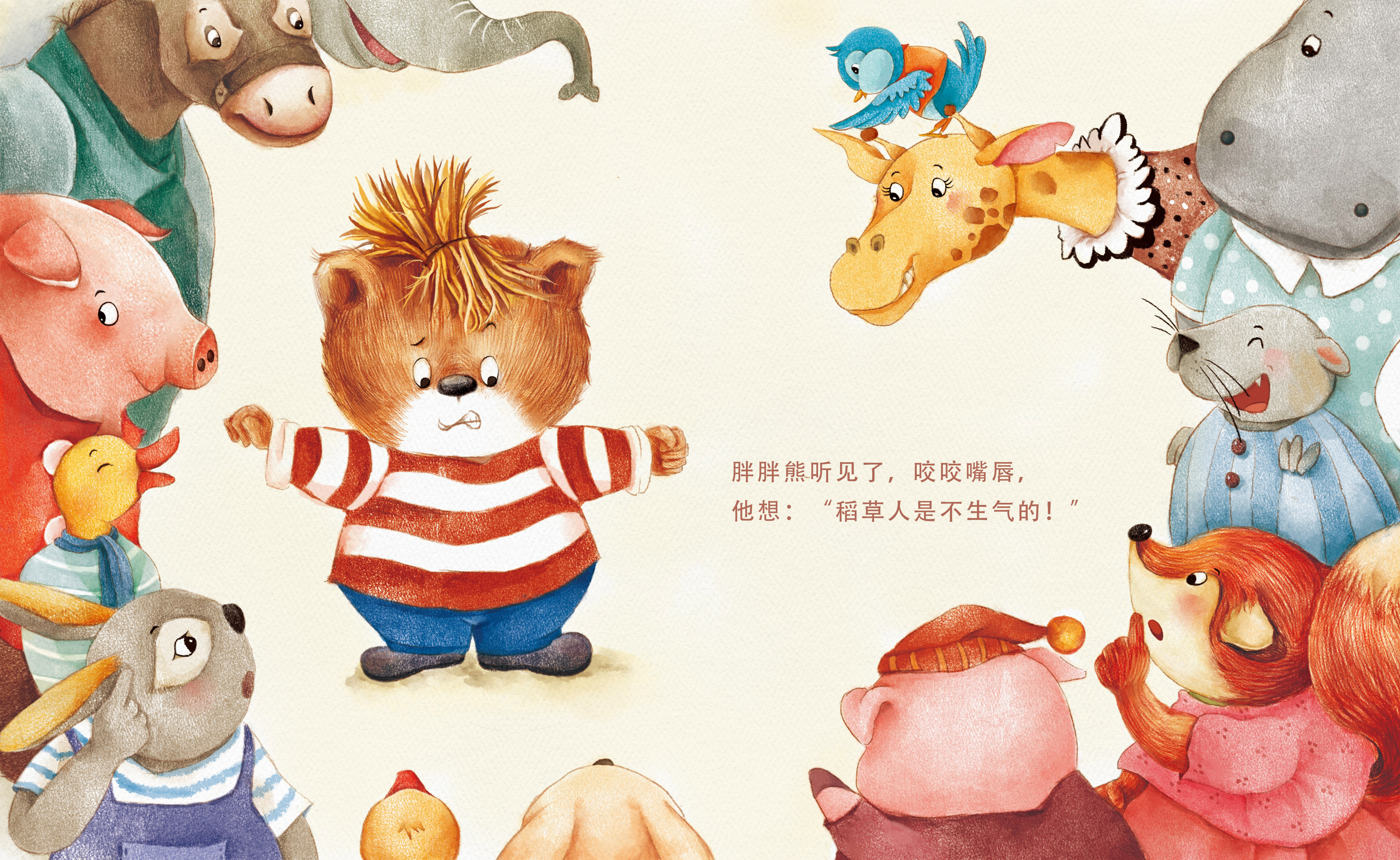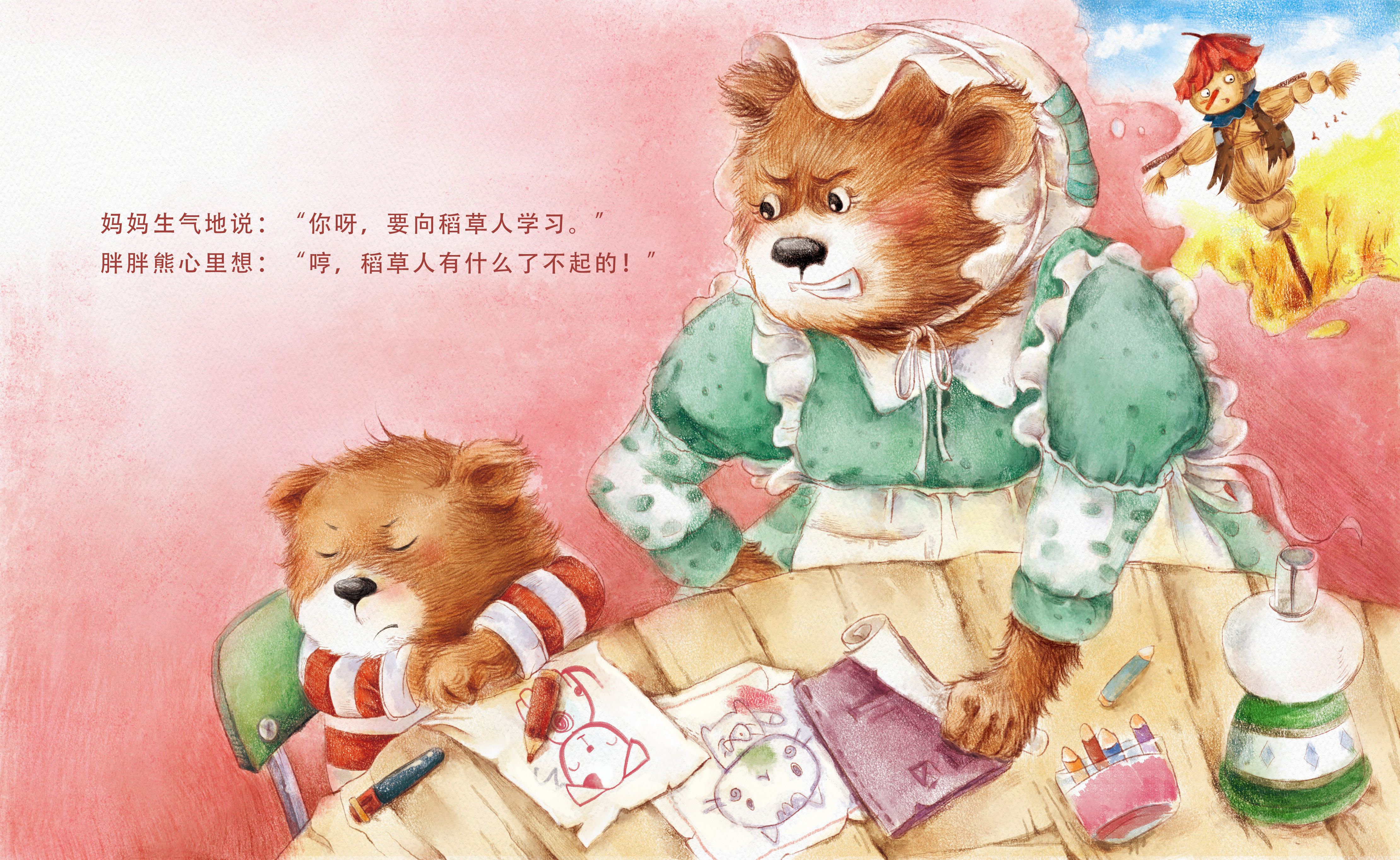 This chubby bear is always inattentive to his homework, drawing a cat one minute and a dog the next. Mum said angrily, "You, you should learn from the scarecrow." Chubby Bear thought to himself, "Hmph what's so great about a scarecrow!" ...
